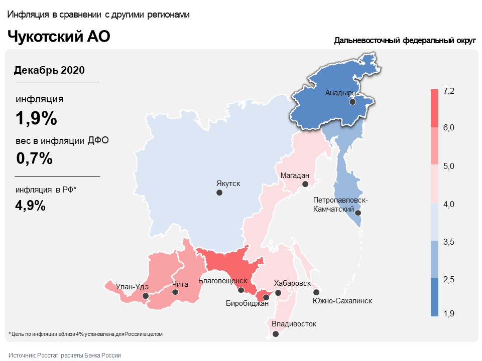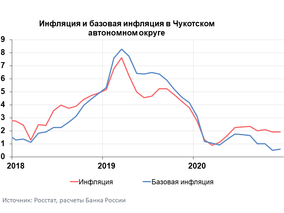 Годовая инфляция на Чукотке в декабре 2020 года по сравнению с предыдущим месяцем не изменилась и составила 1,9%. При этом она оставалась ниже, чем в Дальневосточном федеральном округе (5,0%) и России в целом (4,9%). Динамику инфляции определяли разнонаправленные факторы. С одной стороны, ускорение роста цен на отдельные товары обусловлено произошедшим ранее ослаблением рубля. С другой, замедлению инфляции по-прежнему способствовала реализация мер поддержки региональных производителей Правительством округа.