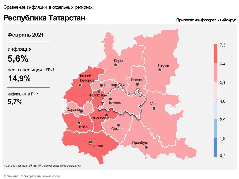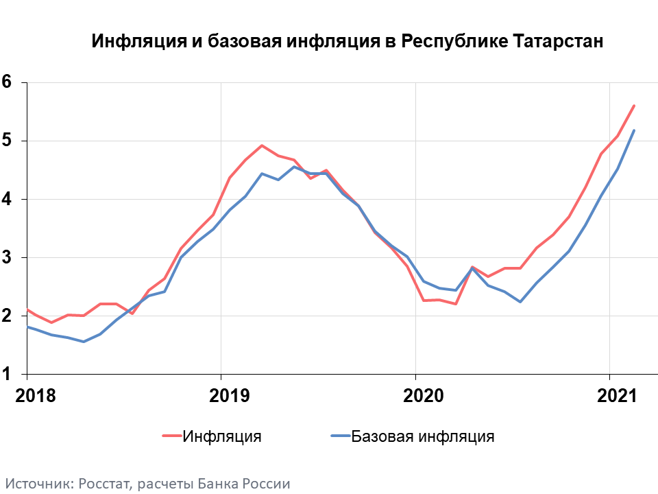 Годовая инфляция в Республике Татарстан в феврале 2021 года ускорилась до 5,6% после 5,1% в январе 2021 года, и по-прежнему остается ниже среднего уровня по России (5,7%) и Приволжскому федеральному округу (ПФО, 5,9%). Ускорение инфляции преимущественно связано с действием временных факторов федерального характера, в том числе увеличением издержек производителей, снижением предложения на отдельных продовольственных рынках, а также с восстановлением спроса на ряд товаров и услуг.