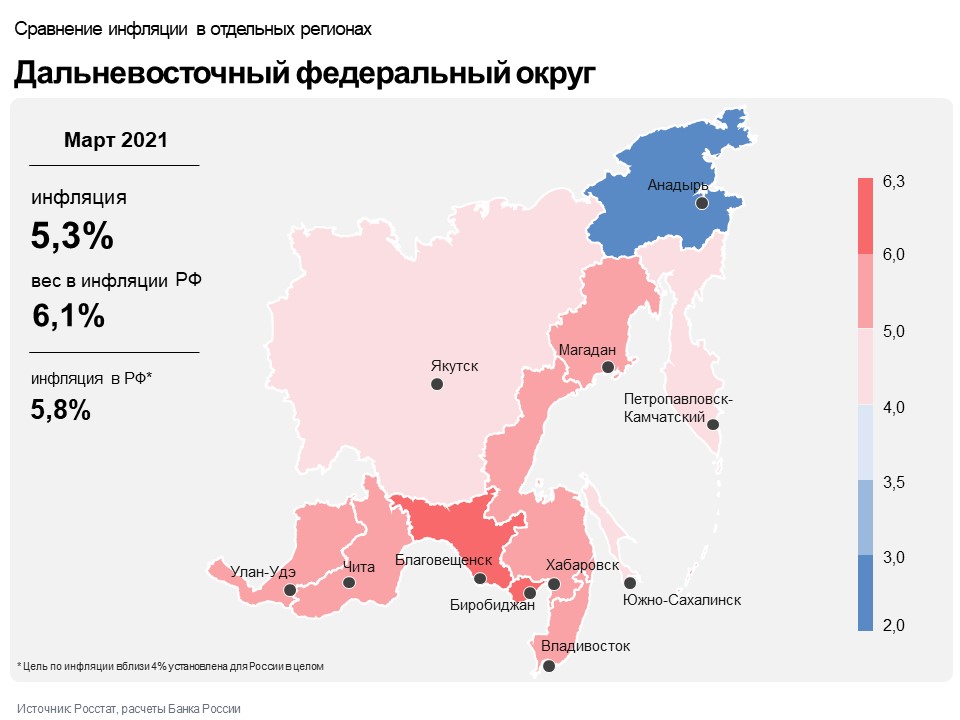В марте по сравнению с февралем наблюдался рост годовой инфляции в семи из одиннадцати регионов ДФО: Камчатском, Приморском и Хабаровском краях, Республиках Бурятия и Саха (Якутия), Амурской и Магаданской областях. В Забайкальском крае инфляция не изменилась. В остальных трех регионах округа — Сахалинской и Еврейской автономной областях, Чукотском автономном округе — годовой рост цен замедлился.