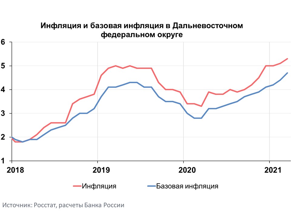 Годовая инфляция в Дальневосточном федеральном округе (ДФО) в марте 2021 года увеличилась до 5,3% после 5,1% в феврале, но оставалась ниже, чем в целом по России, — 5,8%. На динамику цен в округе продолжили оказывать влияние временные факторы: общероссийские — продолжающееся восстановление спроса наряду с сохраняющимся давлением со стороны издержек, а также региональный — снижение предложения на отдельных продовольственных рынках.