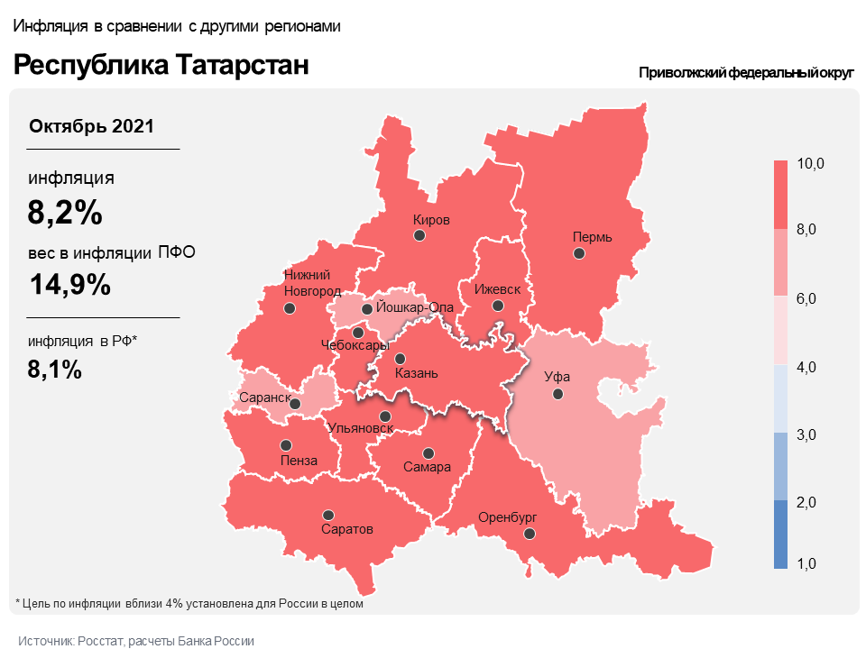 Годовая инфляция в Республике Татарстан в октябре 2021 года ускорилась до 8,20% после 7,71% в сентябре, что соответствует тенденции в Приволжском федеральном округе (ПФО, 8,35% после 7,64%) и в России в целом (8,13% после 7,40%). На динамику цен преимущественно повлияли рост издержек производителей товаров и снижение предложения овощей.