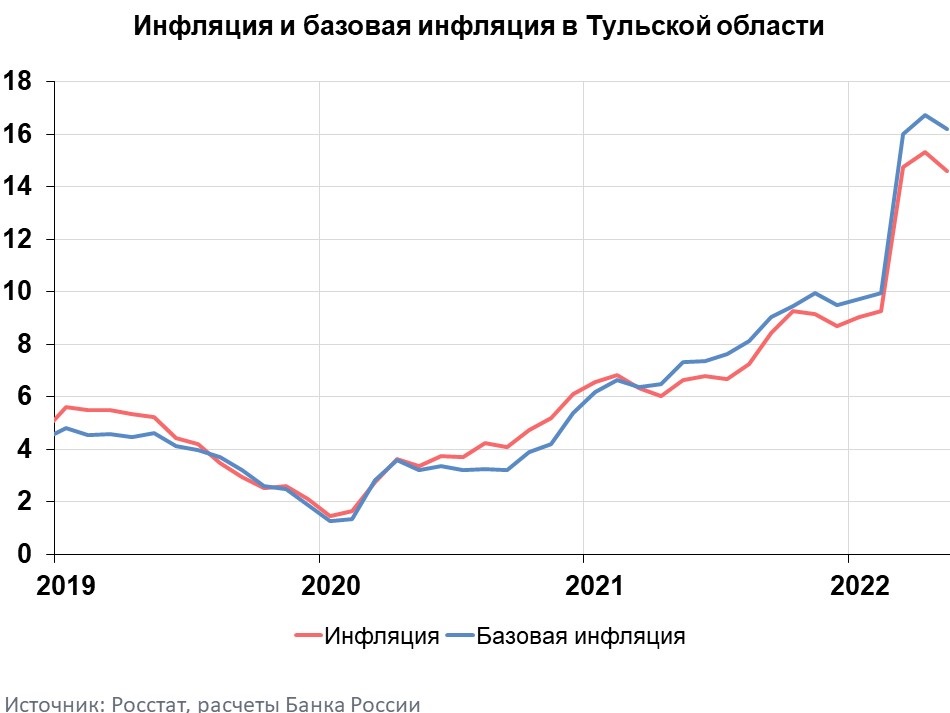 Базовая инфляция в Тульской области замедлилась с 16,75% в апреле 2022 года до 16,22% в мае 2022 года и сложилась выше общего уровня инфляции, что говорит о превышении прироста цен на рыночные компоненты ИПЦ по сравнению с волатильными и административно регулируемыми.