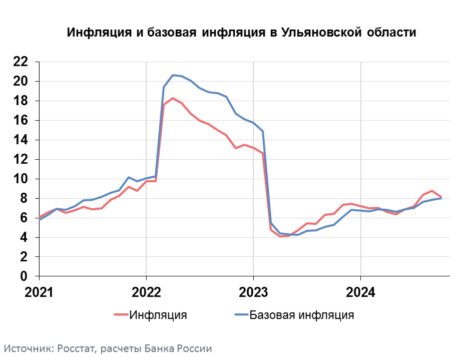 Годовая инфляция в Ульяновской области в сентябре 2024 года уменьшилась и составила 8,14% после 8,78% в августе. Она по-прежнему ниже, чем в Приволжском федеральном округе (8,34%) и в целом в России (8,63%). Главными причинами снижения региональной инфляции стали расширение предложения ряда продуктов, а также эффект высокой сравнительной базы прошлого года.