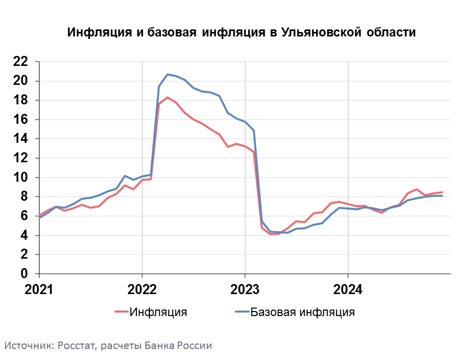 Годовая инфляция в Ульяновской области в ноябре 2024 года увеличилась и составила 8,47% после 8,36% в октябре. При этом она сложилась ниже, чем в Приволжском федеральном округе (8,76%) и в целом в России (8,88%). Инфляция в регионе увеличилась главным образом из-за роста издержек производителей и поставщиков ряда товаров и услуг.