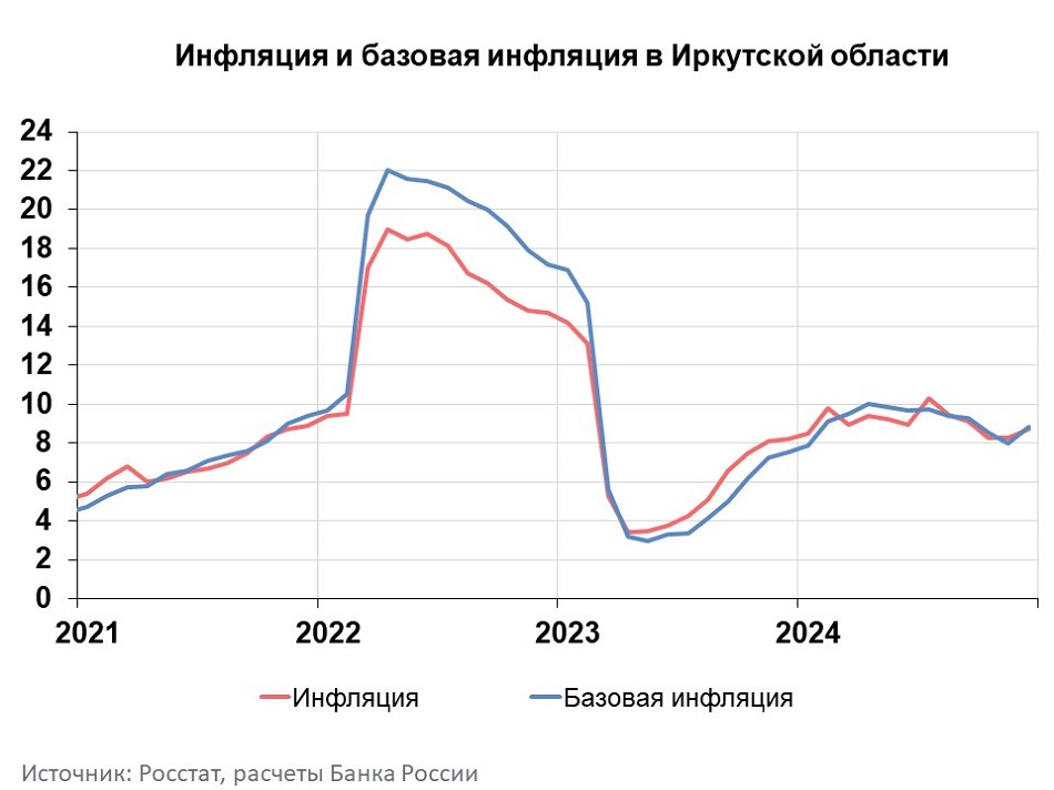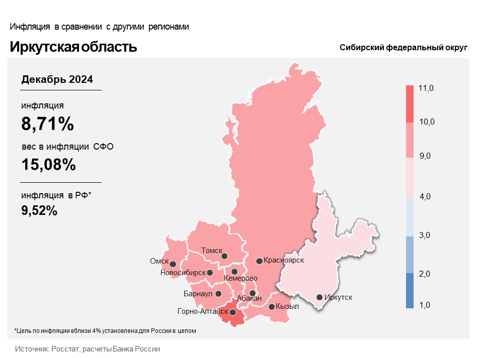 Годовая инфляция в Иркутской области в декабре ускорилась до 8,71% после 8,24% в ноябре. Инфляция в регионе осталась ниже, чем в Сибирском федеральном округе (9,53%) и в целом по России (9,52%). Годовой рост цен в регионе ускорился в основном из-за переноса в цены увеличившихся издержек производителей и поставщиков некоторых товаров, в том числе из-за ослабления рубля. Кроме того, снизилось предложение на отдельных товарных рынках.