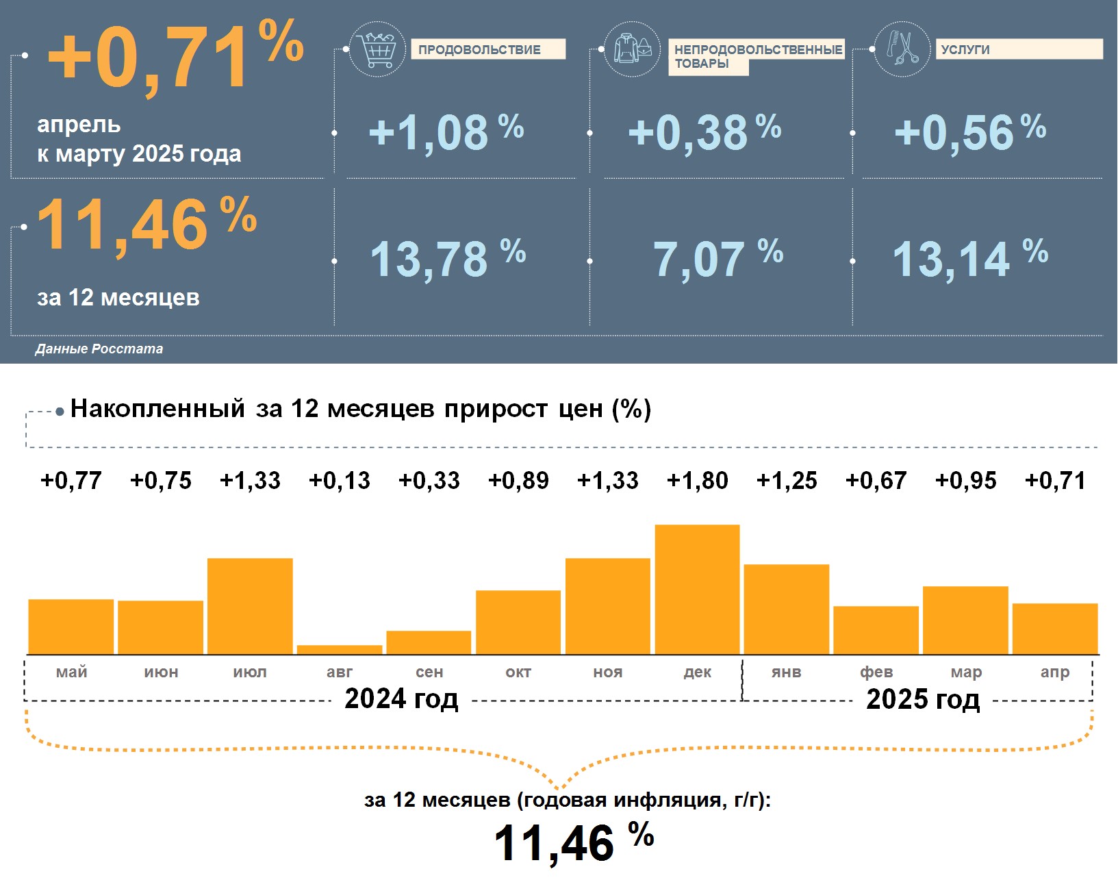 Цены в Ульяновской области в апреле 2025 года, по данным Росстата, выросли на 0,71% к марту. Годовая инфляция увеличилась и составила 11,46%. Это выше, чем в целом по стране (10,23%).