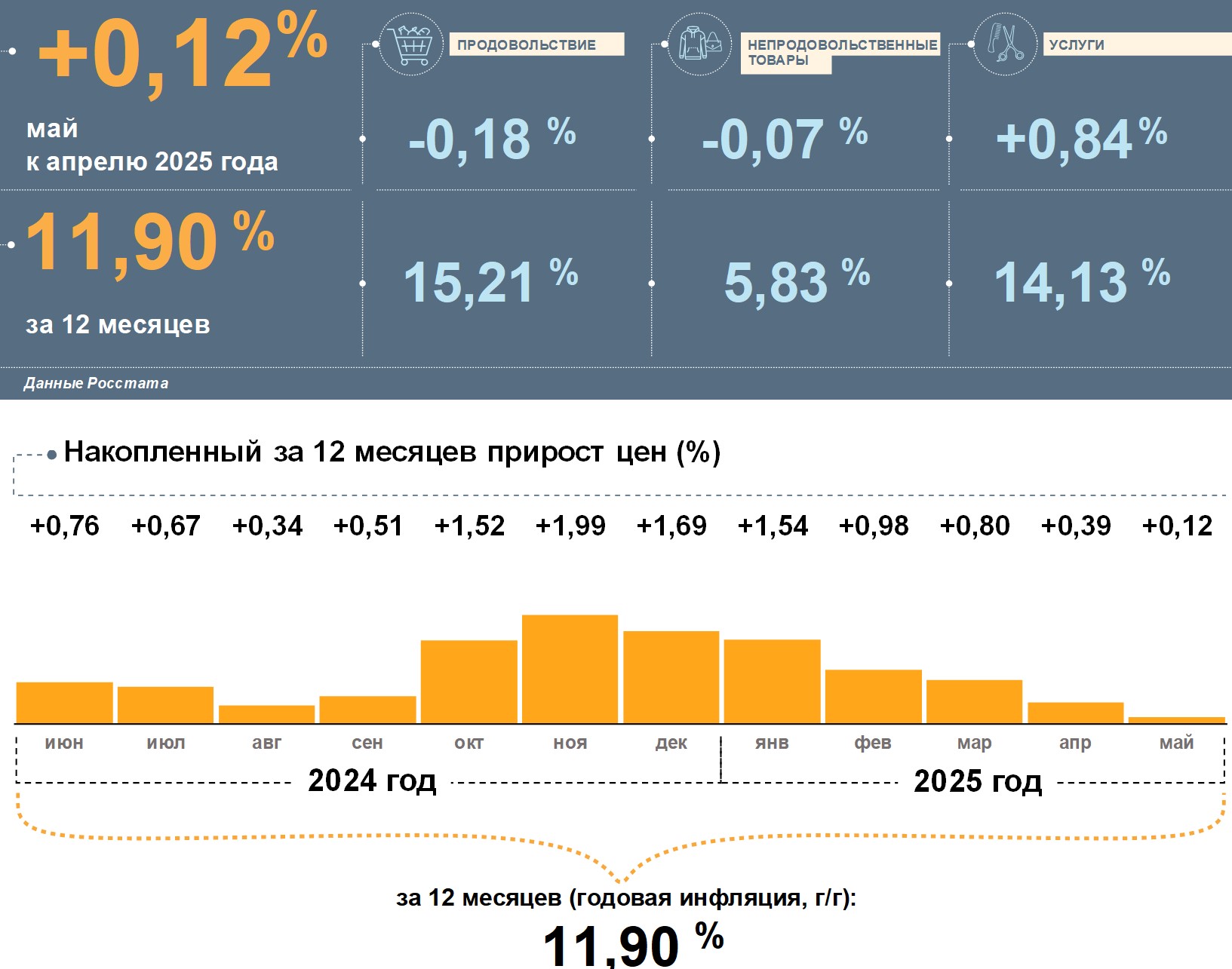 Цены в Чувашской Республике в мае 2025 года, по данным Росстата, увеличились на 0,12% к апрелю. Годовая инфляция снизилась и составила 11,90%. Это выше, чем в целом по стране (9,88%).