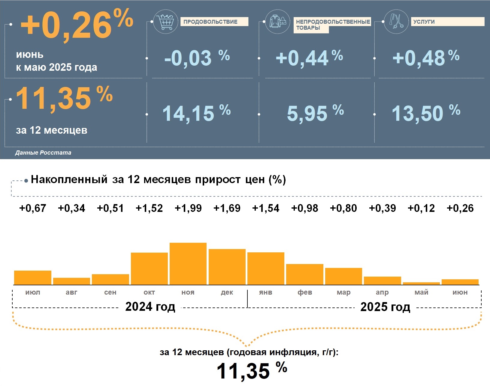 Цены в Чувашской Республике в июне 2025 года, по данным Росстата, увеличились на 0,26% к маю. Годовая инфляция замедлялась третий месяц подряд и составила 11,35%. Это выше, чем в целом по стране (9,40%).