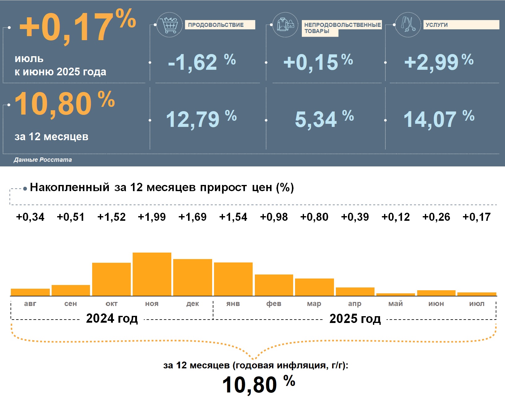 Цены в Чувашской Республике в июле 2025 года, по данным Росстата, выросли на 0,17% к июню. Годовая инфляция снизилась и составила 10,80%. Это выше, чем в целом по стране (8,79%).