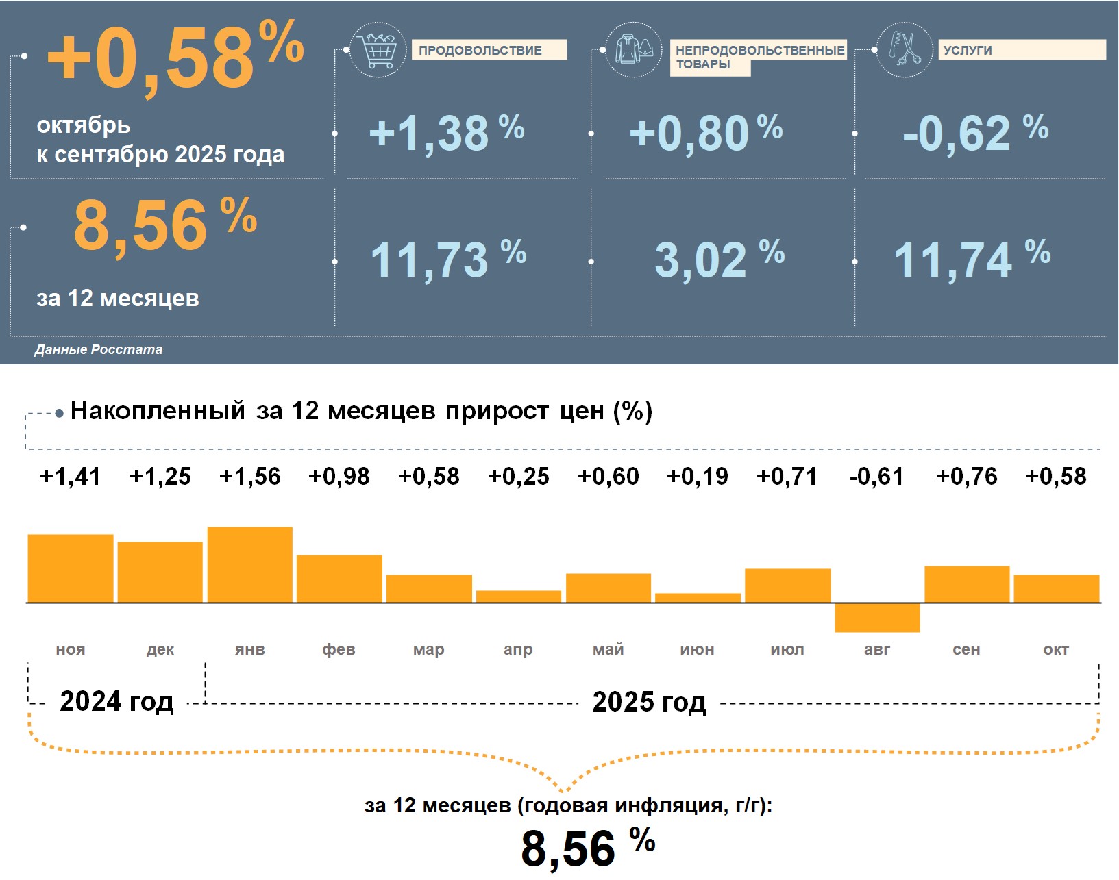 Цены в Республике Татарстан в октябре 2025 года, по данным Росстата, выросли на 0,58% к сентябрю. Годовая инфляция снизилась до 8,56%. Это все еще выше, чем в целом по стране (7,71%), но ниже, чем в Приволжском федеральном округе (8,66%).