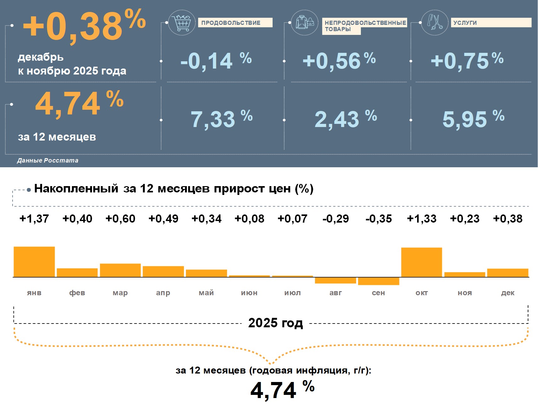 Цены в Республике Алтай в декабре 2025 года, по данным Росстата, выросли на 0,38% к ноябрю. Годовая инфляция продолжила снижаться и составила 4,74%. Это меньше, чем в целом по стране (5,59%).