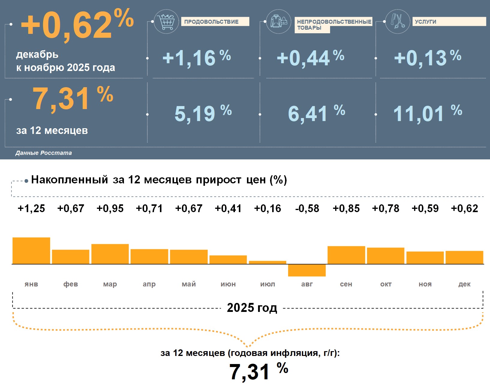 Цены в Ульяновской области в декабре 2025 года, по данным Росстата, выросли на 0,62% к ноябрю. Годовая инфляция продолжила снижаться и по итогам года составила 7,31%. Это больше, чем в целом по стране (5,59%).