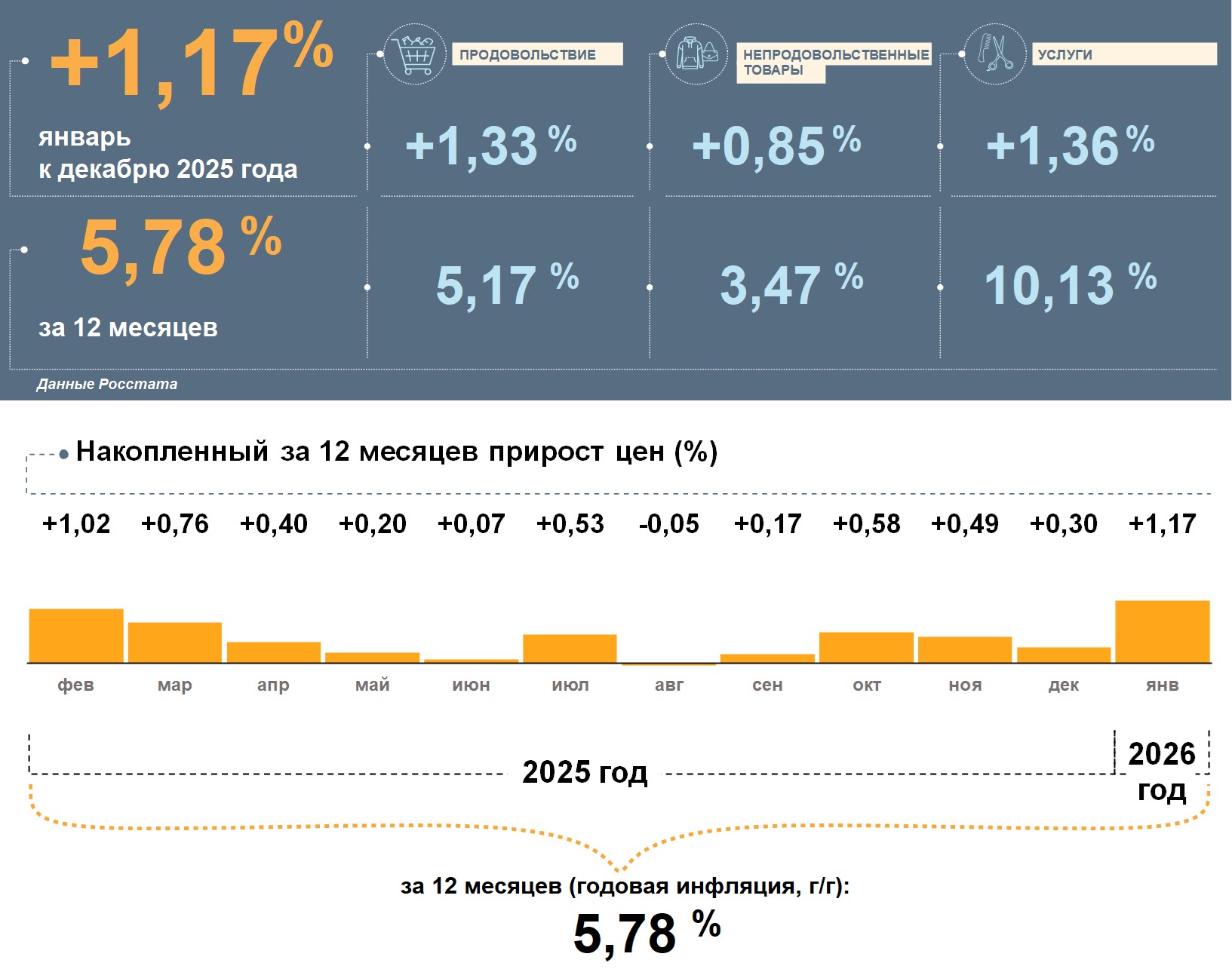 Цены в Ивановской области в январе 2026 года, по данным Росстата, выросли на 1,17% к декабрю 2025 года. Годовая инфляция снизилась и составила 5,78%. Это ниже, чем в целом по стране (6,00%).