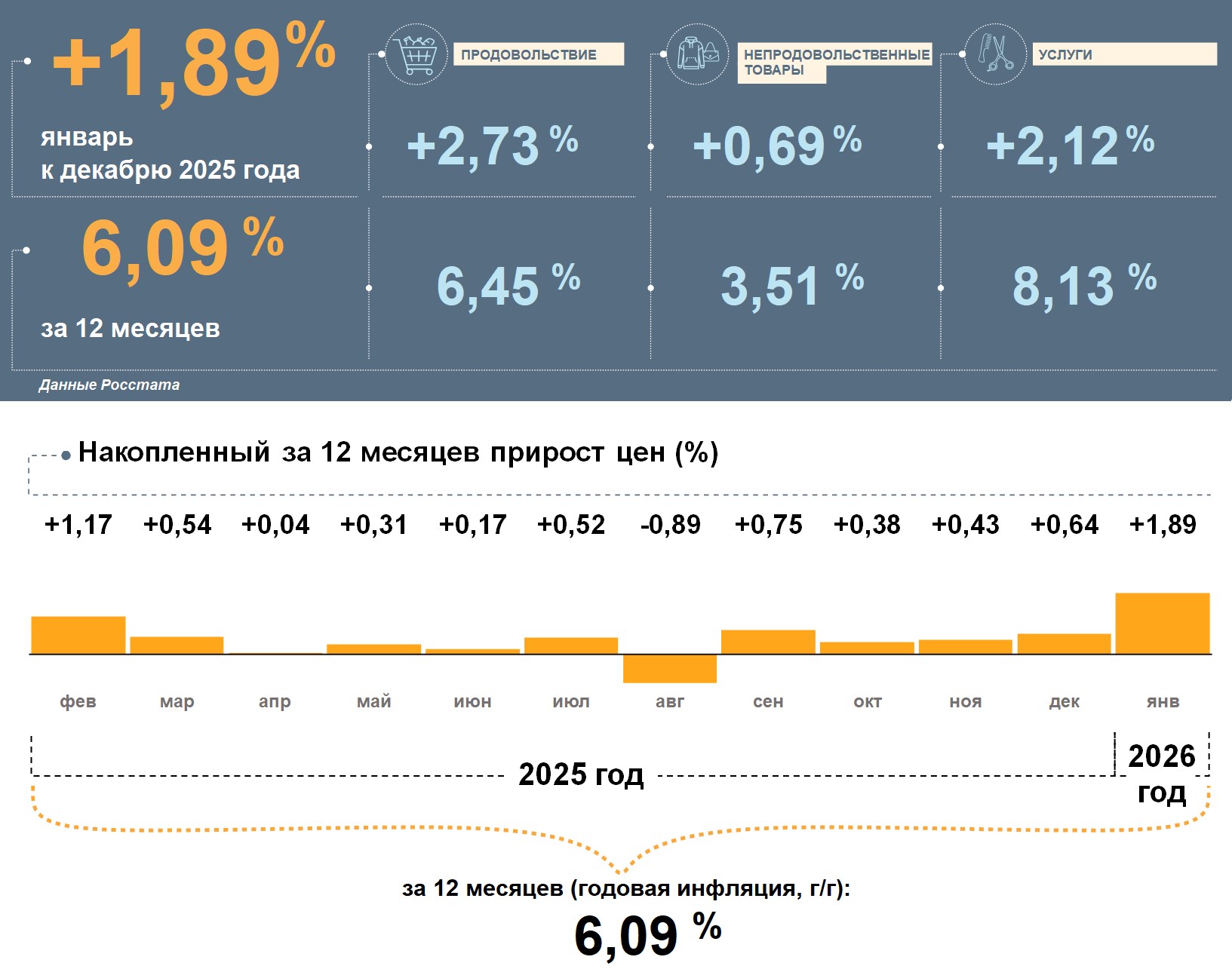 Цены в Ставропольском крае в январе 2026 года, по данным Росстата, выросли на 1,89% к декабрю. Годовая инфляция ускорилась и составила 6,09%. Это немного выше, чем в целом по стране (6,00%).