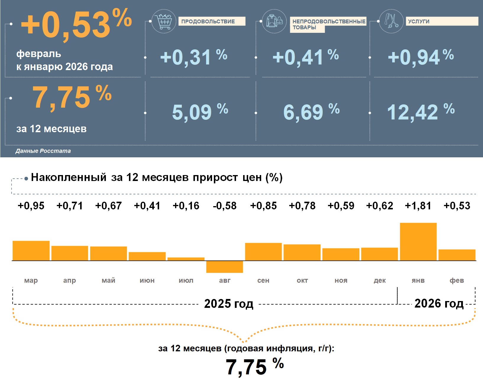 Цены в Ульяновской области в феврале 2026 года, по данным Росстата, выросли на 0,53% к январю. Годовая инфляция замедлилась и составила 7,75%. Это больше, чем в целом по стране (5,91%).