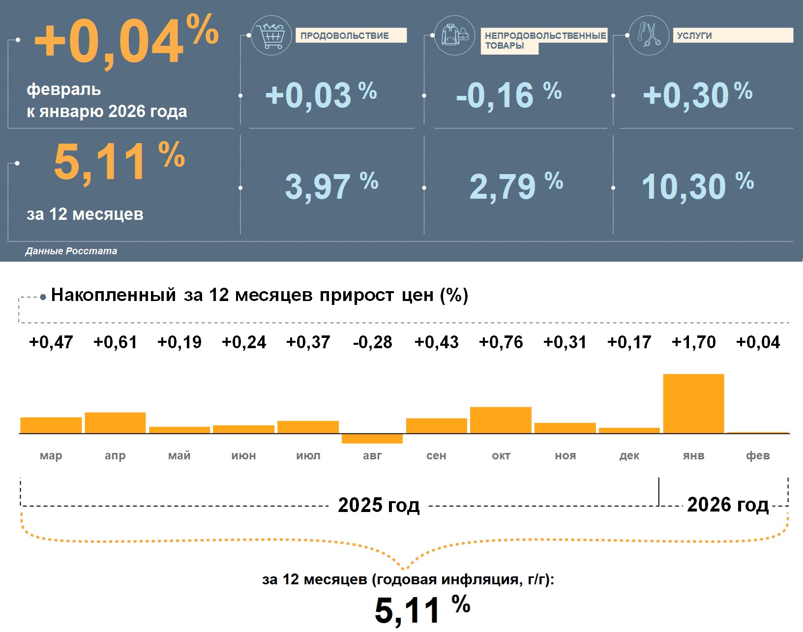 Цены в Волгоградской области в феврале 2026 года, по данным Росстата, выросли на 0,04% к январю. Годовая инфляция в регионе снизилась и составила 5,11%. Это ниже, чем по стране (5,91%).