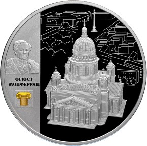 A silver proof coin «St. Isaac’s Cathedral (Auguste Montferrand)» in denomination of 25 Roubles (fine metal content 155.5 g, fineness 925/1000, diameter 60.0 mm, mintage 1500 pcs), has the rim raised on both sides of the coin along the circumference. The edge of the coin is corrugated.