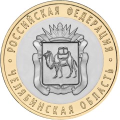 A coin «Chelyabinsk Region» is combined, 27.0 mm in diameter and consists of two parts — a disc made of white metal and an outer ring around the disc made of yellow metal. The coin has the rim raised on both sides of the coin along the circumference. The edge of the coin is corrugated and has an inscription «ДЕСЯТЬ РУБЛЕЙ» (TEN ROUBLES) recurring twice and divided by asterisks.