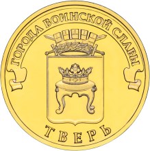 The reverse side of the coin has a relief image of Tver emblem. There are inscriptions along the circumference — «ГОРОДА ВОИНСКОЙ СЛАВЫ» (TOWNS OF MARTIAL GLORY) on top and «ТВЕРЬ» (TVER) at the bottom.