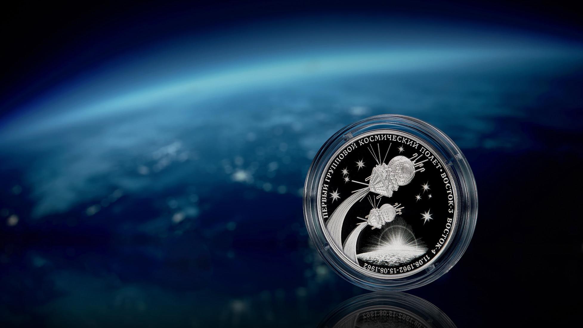 Sixty years ago, two spacecraft Vostok‑3 and Vostok‑4 were in space simultaneously for the first time. The flight lasted for the record 94 hours and 22 minutes. To mark this event, on 12 July 2022, the Bank of Russia issues a new commemorative coin — ‘The First Group Spaceflight’ of The Cosmos series (Catalogue No.