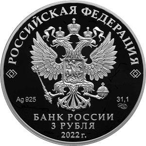 The obverse of the coin features a relief image of the National Coat of Arms of the Russian Federation and the inscriptions ‘РОССИЙСКАЯ ФЕДЕРАЦИЯ’ (RUSSIAN FEDERATION) and ‘БАНК РОССИИ’ (BANK OF RUSSIA), the coin denomination ‘3 РУБЛЯ’ (3 RUBLES), the year of issue ‘2022 г.’ (2022), the chemical symbol of the metal according to Mendeleev’s Periodic Table of Elements, fineness, the St. Petersburg Mint trademark, and fine metal content.