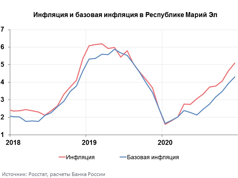 Годовая инфляция в Марий Эл в декабре 2020 года составила 5,1%, ускорившись по сравнению с ноябрем на 0,4 п.п. При этом региональная инфляция осталась ниже уровня ПФО (5,3%), но по-прежнему превышает среднее по России значение (4,9%). Ослабление рубля, произошедшее в предыдущие месяцы, сокращение предложения на отдельных рынках и эффект низкой сравнительной базы прошлого года повлияли на ускорение общего роста цен и стоимости продовольственных и непродовольственных товаров в частности. Инфляция услуг продолжила замедляться из-за стремления мобильных операторов повысить лояльность клиентов и эффекта базы.