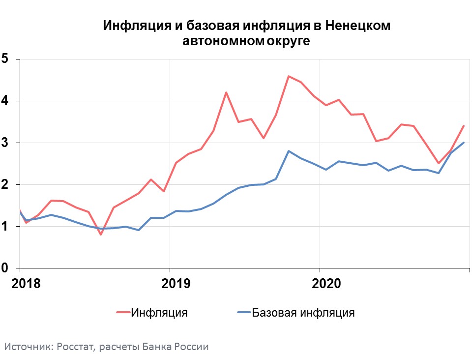 Годовая инфляция в Ненецком автономном округе ускорилась в декабре 2020 года до 3,4% после 2,8% месяцем ранее. При этом годовой темп прироста цен в регионе был значительно ниже, чем по Северо-Западному федеральному округу (4,8%) и в целом по стране (4,9%). Основное влияние на динамику инфляции оказали общие факторы – временное снижение предложения отдельных продовольственных и непродовольственных товаров и отложенный эффект от ослабления рубля осенью 2020 года. Кроме того, временный региональный фактор, связанный с услугами транспортировки, оказал дополнительное влияние на динамику цен в регионе.
