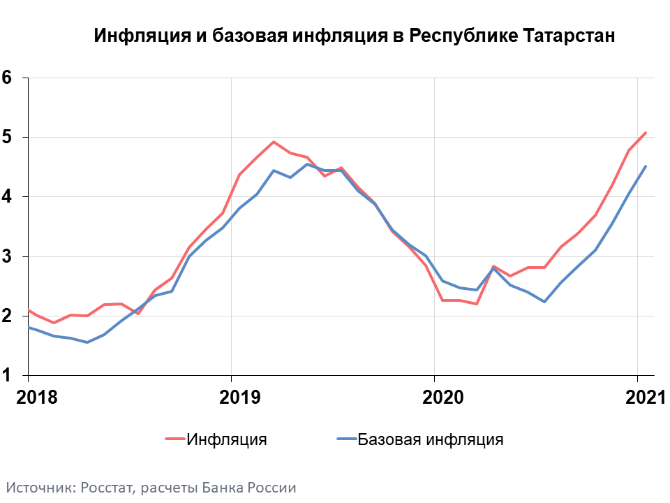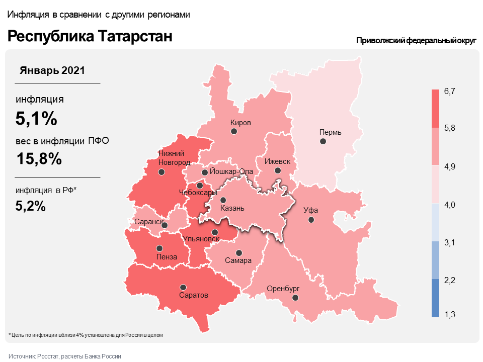 Годовая инфляция в Республике Татарстан в январе 2021 года ускорилась до 5,1% после 4,8% в декабре 2020 года, но по-прежнему остается ниже среднего уровня по России (5,2%) и Приволжскому федеральному округу (ПФО, 5,5%). Ускорение инфляции связано с действием временных факторов федерального характера: снижением предложения ряда сельскохозяйственных культур, ростом цен на продовольствие на мировых рынках и ослаблением рубля, произошедшим в 2020 году.