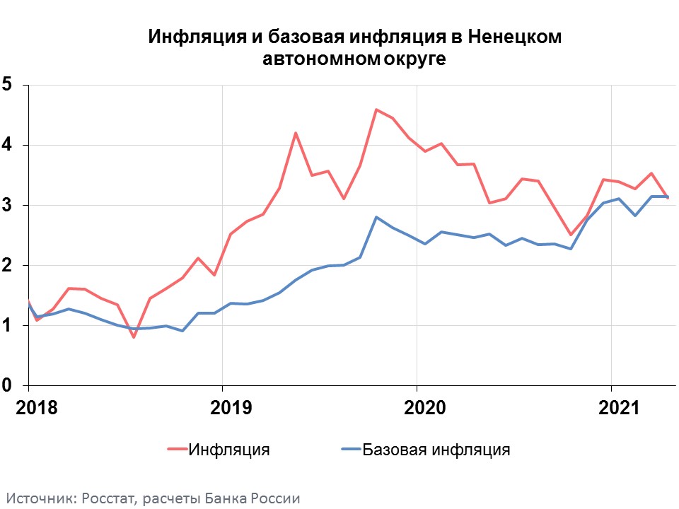 Годовая инфляция в Ненецком автономном округе в апреле 2021 года замедлилась до 3,12% после 3,53% месяцем ранее. Годовой темп прироста цен в регионе оставался существенно ниже, чем в целом по стране (5,53%) и самым низким в Северо-Западном федеральном округе (СЗФО), где инфляция составила 5,19%. Замедление годовых темпов прироста цен в основном обусловлено эффектом высокой базы прошлого года, когда в начале периода распространения коронавируса спрос населения на некоторые продукты и издержки отдельных компаний в сфере услуг возросли.