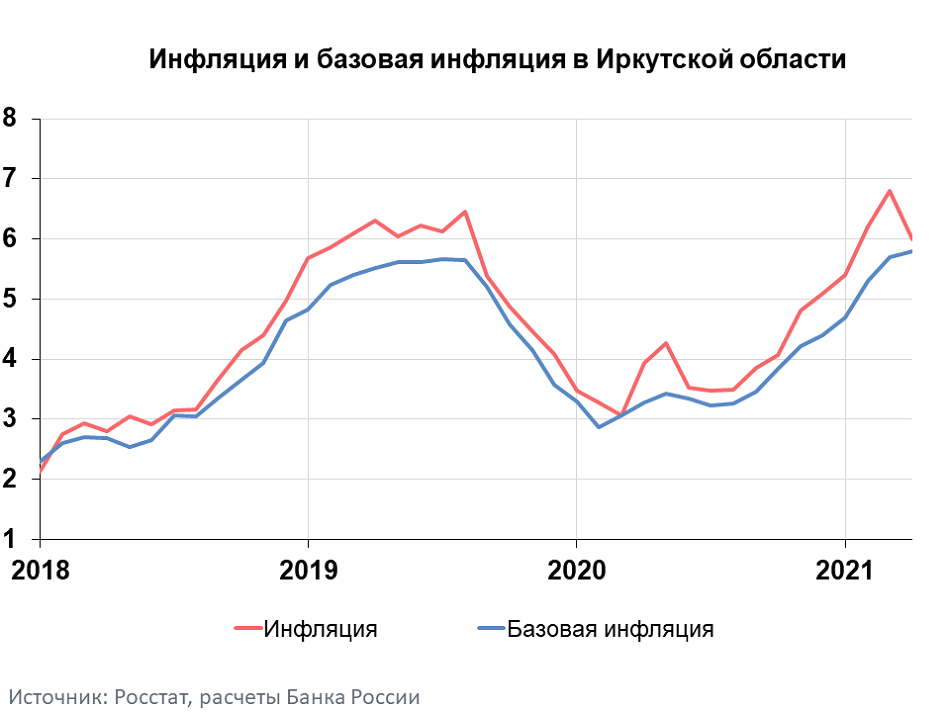 Годовая инфляция в Иркутской области в апреле снизилась на 0,81 п.п., до 6,01%, оставаясь при этом выше значений по Сибирскому федеральному округу (5,57%) и России в целом (5,53%). Динамику инфляции во многом определил региональный фактор — расширение предложения продукции собственного производства. Инфляцию замедлил также эффект базы прошлого года, когда отдельные продукты питания дорожали из-за выросшего с началом пандемии спроса.