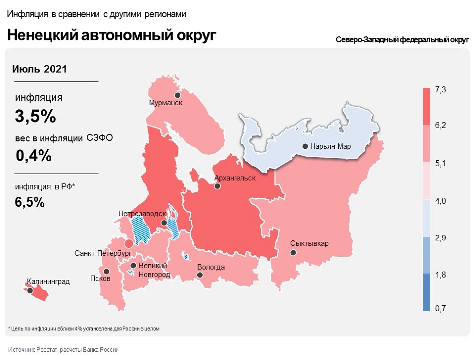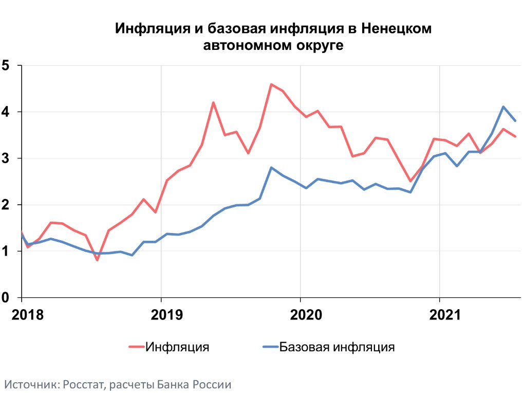 Годовая инфляция в Ненецком автономном округе в июле 2021 года замедлилась до 3,47% после 3,63% месяцем ранее. Годовой темп прироста цен в регионе оставался существенно ниже, чем в целом по стране (6,46%), и самым низким в Северо-Западном федеральном округе, где инфляция составила 6,34%. Замедление годовых темпов прироста цен в основном обусловлено общефедеральными факторами: расширением предложения плодоовощной продукции и мерами Правительства Российской Федерации по стабилизации цен на зерно.