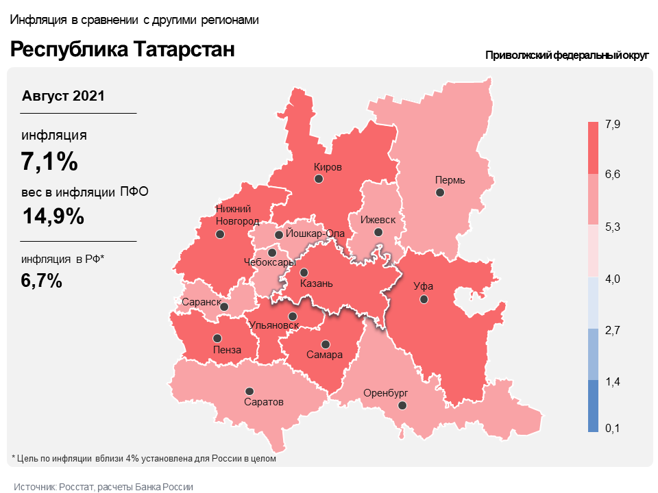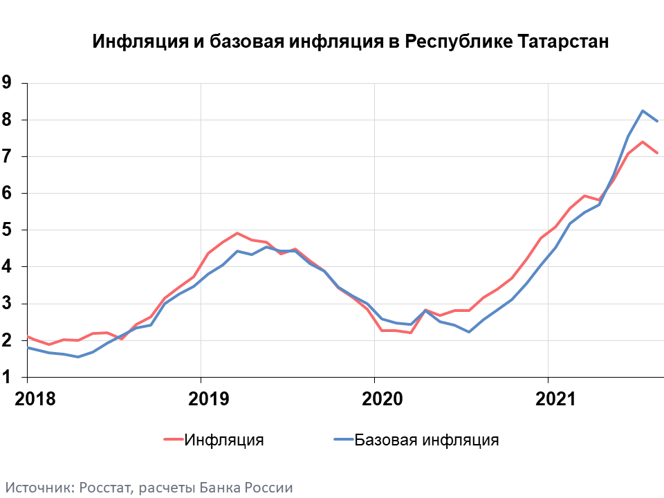 Годовая инфляция в Республике Татарстан в августе 2021 года замедлилась до 7,10% после 7,41% в июле. Это отличается от тенденции ускорения роста цен, которая наблюдалась в Приволжском федеральном округе (ПФО, прирост 6,86% после 6,77%) и в России в целом (6,68% после 6,46%). На динамику цен в регионе повлияли расширение предложения овощей и фруктов, снижение цен на мировых рынках металла и древесины, меры, предпринимаемые органами власти для стабилизации уровня цен, а также изменение схемы индексации тарифов газоснабжения.