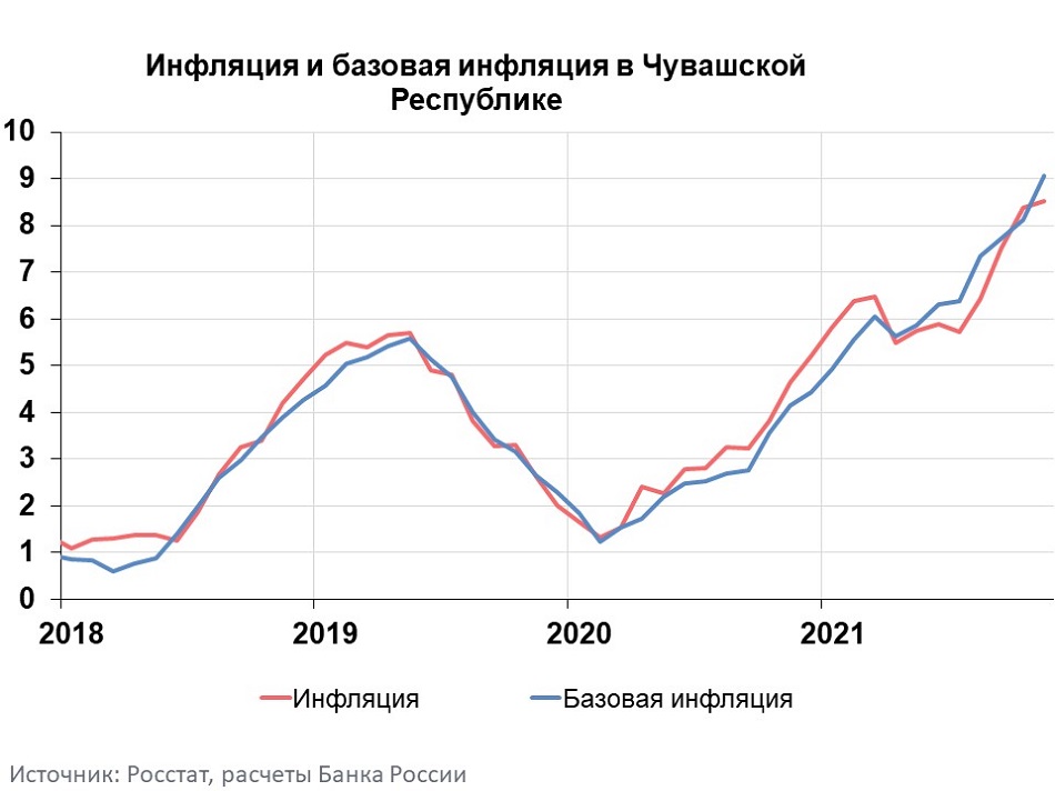 Годовая инфляция в Чувашии в ноябре 2021 года ускорилась до 8,53% после 8,39% в октябре. Это соответствует динамике в Приволжском федеральном округе (8,67% после 8,35%) и России в целом (8,40% после 8,13%). Повышению инфляции в республике способствовали продолжающееся увеличение издержек производителей непродовольственных товаров и организаций сферы услуг, ограниченное предложение отдельных непродовольственных товаров, а также рост спроса на некоторые виды услуг. Сдерживающее влияние оказало увеличение предложения местных овощей и импортных фруктов.