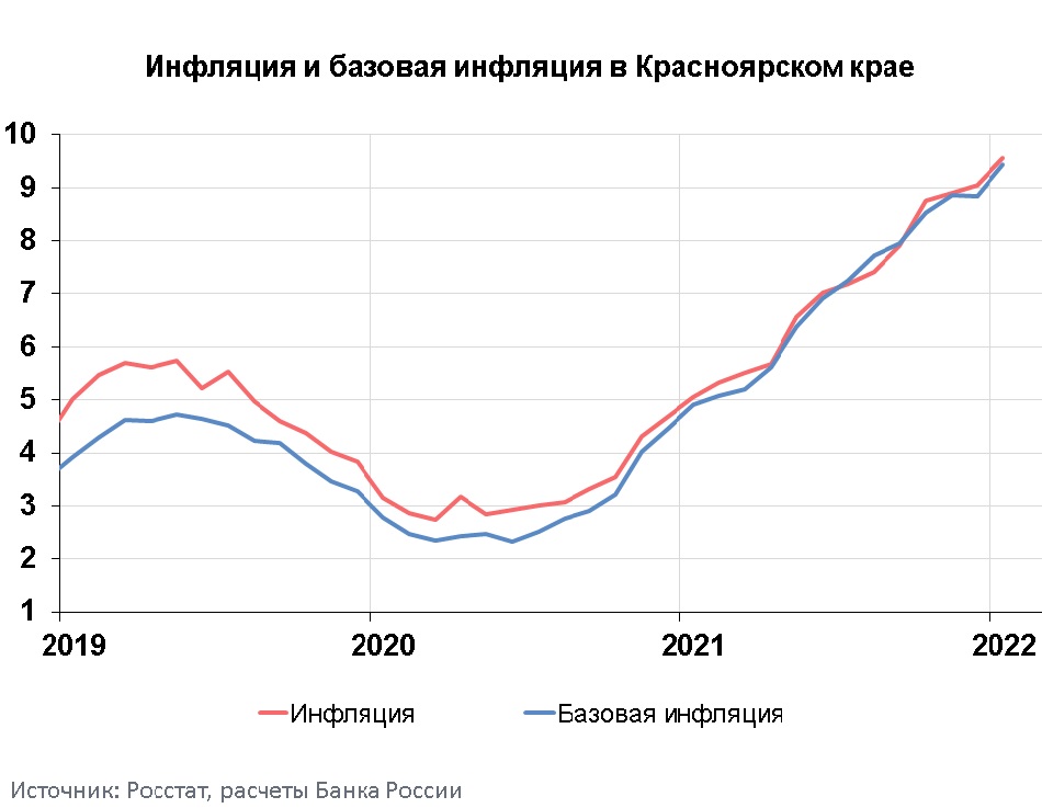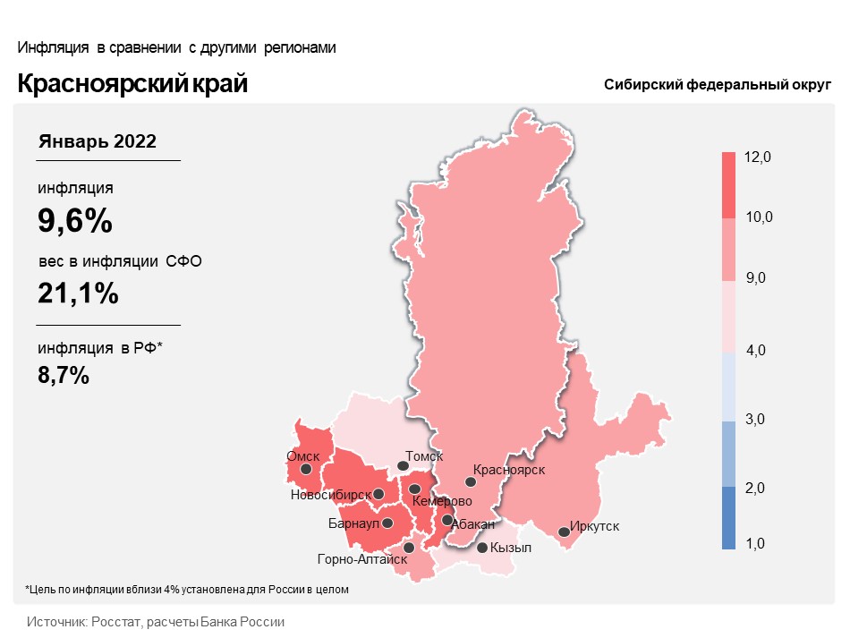 В январе годовая инфляция в Красноярском крае ускорилась на 0,52 п.п., до 9,56%. Это ниже показателя по Сибирскому федеральному округу (9,92%), но выше показателя по России (8,73%). Ускорение инфляции в регионе складывалось под влиянием роста издержек производителей и поставщиков и повышенного спроса на ряд непродовольственных товаров длительного пользования.