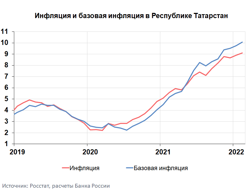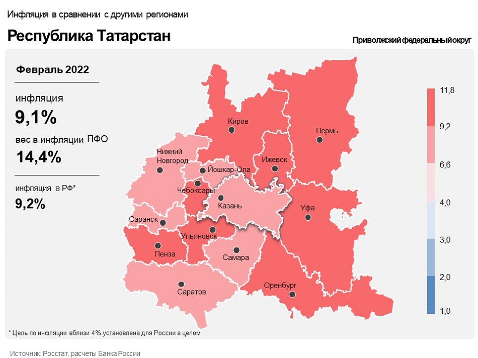 Годовая инфляция в Республике Татарстан в феврале 2022 года ускорилась до 9,07% после 8,90% в январе. При этом она сложилась ниже, чем в Приволжском федеральном округе (ПФО, 9,44%) и в России в целом (9,15%). На динамику цен в республике преимущественно повлияли рост издержек производителей товаров и произошедшее в конце февраля ослабление рубля.