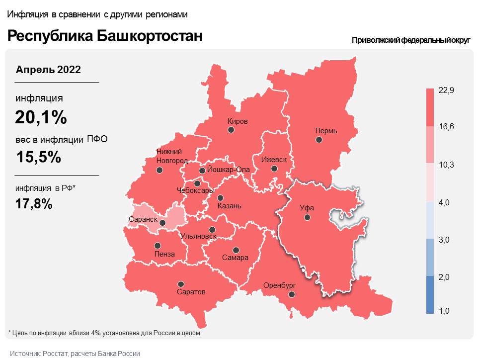 Годовая инфляция в Приволжском федеральном округе в апреле 2022 года ускорилась до 18,79% после 17,84% месяцем ранее. Это выше, чем в целом по России – 17,83% в апреле. Ускорение инфляции в округе в основном вызвано усилением санкционного давления, приведшим к увеличению издержек производителей и поставщиков, а также сокращению предложения отдельных товаров.