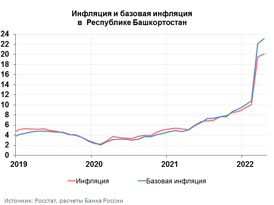 В апреле 2022 года инфляция в Башкортостане увеличилась на 0,58 п.п., до 20,09%, оставаясь выше показателей по Приволжскому федеральному округу (18,79%) и по России в целом (17,83%). Динамика потребительских цен в регионе формировалась преимущественно под влиянием общероссийских факторов: роста издержек производителей и поставщиков товаров и услуг на фоне нарушения производственно-логистических цепочек в условиях усиления санкционного давления.