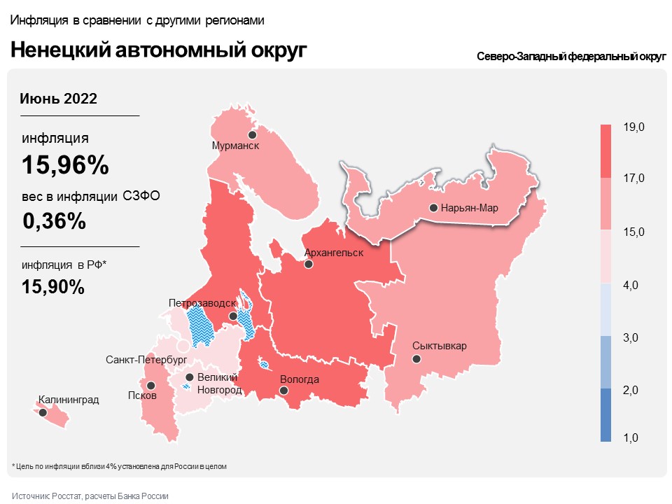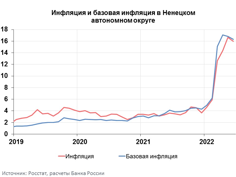 Годовая инфляция в Ненецком автономном округе в июне 2022 года замедлилась до 15,96% после 16,65% месяцем ранее. Она сложилась выше, чем в целом по стране (15,90%) и в Северо-Западном федеральном округе (15,49%). Динамику инфляции в регионе в основном обусловили общероссийские факторы – расширение предложения и снижение спроса на отдельные товары, а также укрепление рубля. Дополнительное влияние оказал региональный фактор – повышение доступности услуг воздушного транспорта для жителей Ненецкого автономного округа.