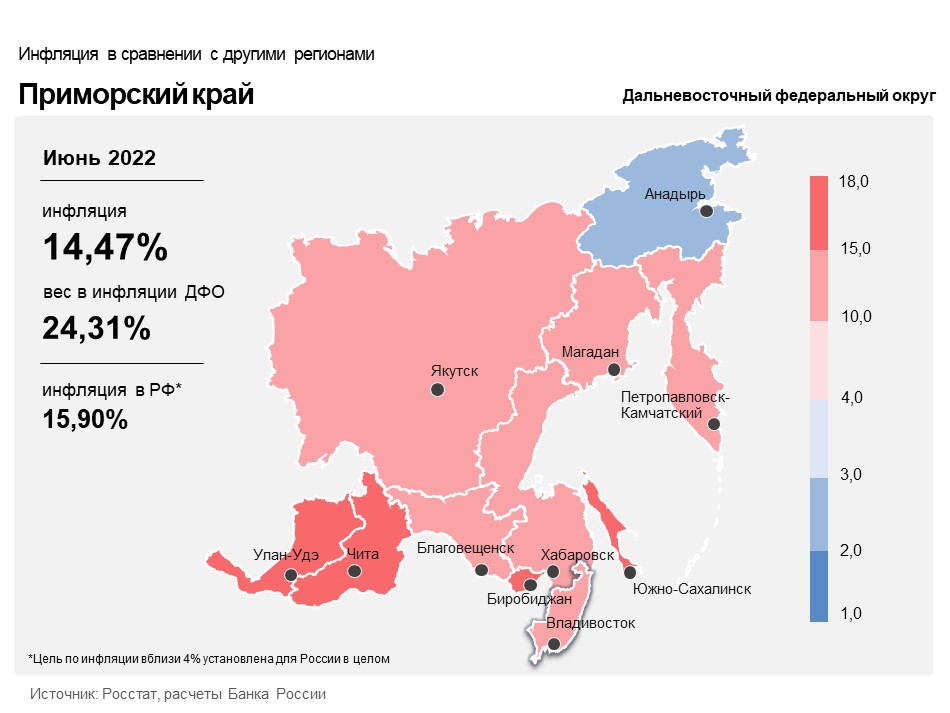 Годовая инфляция в Дальневосточном федеральном округе в июне 2022 года замедлилась до 14,43% после 15,05% в мае. При этом она осталась ниже, чем в целом по России, — 15,90%. Замедлению роста цен на Дальнем Востоке способствовало расширение предложения на отдельных товарных рынках. Кроме того, значительное влияние на ценовую динамику оказала коррекция цен на некоторые товары и услуги в условиях продолжающегося укрепления рубля и ослабления потребительского спроса после резкого всплеска в марте.