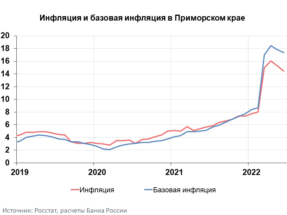 Годовая инфляция в Приморье в июне 2022 года замедлилась и составила 14,47% после 15,32% в мае, что выше значения по Дальневосточному федеральному округу — 14,43%, но по-прежнему ниже, чем по России, — 15,90%. Замедлению роста цен в крае способствовало расширение предложения на отдельных товарных рынках и в сфере услуг. Кроме того, значительное влияние на ценовую динамику оказала коррекция цен на некоторые товары и услуги в условиях продолжавшегося укрепления рубля и ослабления потребительского спроса после резкого всплеска в марте.