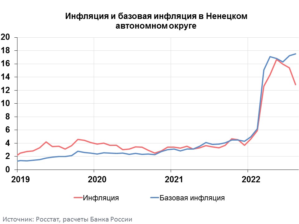 Годовая инфляция в Ненецком автономном округе в августе 2022 года замедлилась до 12,87% после 15,37% месяцем ранее. Она сложилась ниже, чем в целом по стране (14,30%) и в Северо-Западном федеральном округе (13,87%). Замедление инфляции в регионе в основном связано с повышением доступности услуг воздушного транспорта в регионе. Дополнительное влияние оказало расширение предложения отдельных товаров, а также снижение потребительской активности.