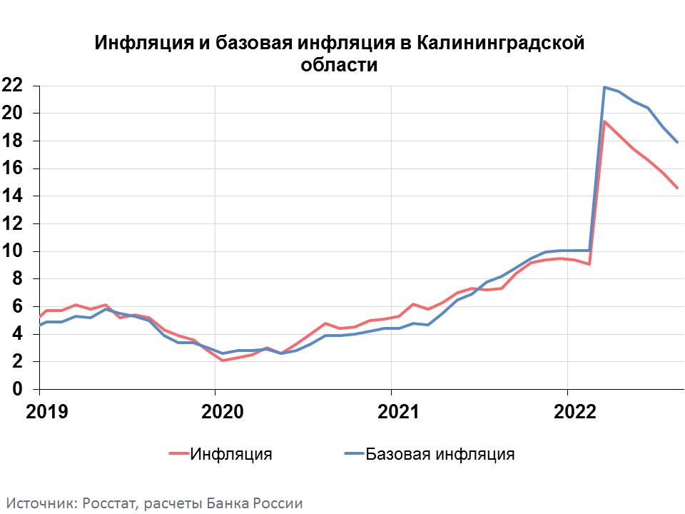 Годовая инфляция в Калининградской области в августе 2022 года замедлилась до 14,63% после 15,67% в июле. Годовой темп прироста цен в регионе оставался выше, чем по Северо-Западному федеральному округу (13,87%) и в целом по стране (14,30%). Динамика инфляции в регионе была в основном определена расширением предложения отдельных товаров и услуг и охлаждением потребительского спроса. Дополнительное влияние оказал региональный фактор – некоторое улучшение транспортной доступности области.