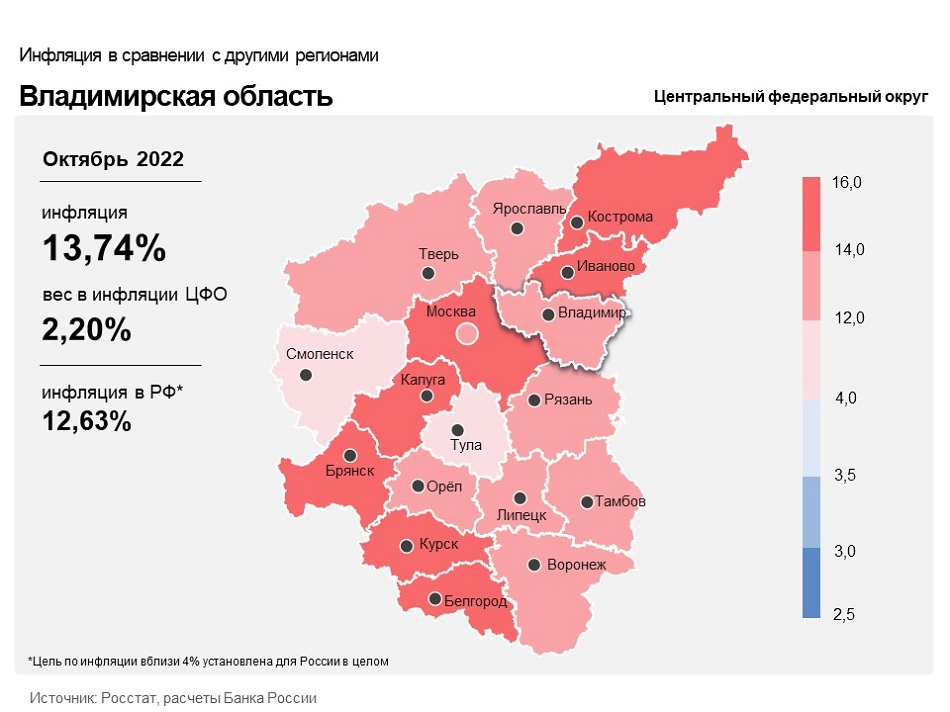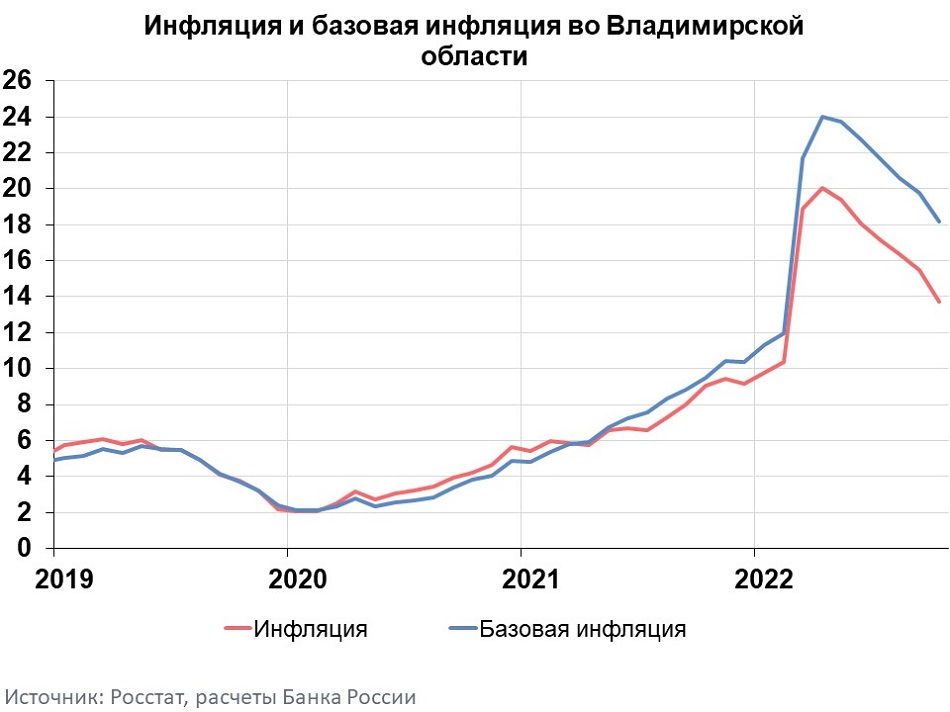 В октябре 2022 года во Владимирской области годовая инфляция снизилась до 13,74% с 15,47% в сентябре, что соответствует общероссийской тенденции. Уровень инфляции в регионе сложился выше, чем в Центральном федеральном округе и России (13,16% и 12,63% соответственно). Динамика цен была обусловлена увеличением предложения отдельных продовольственных товаров, слабой потребительской активностью и сокращением издержек производителей.