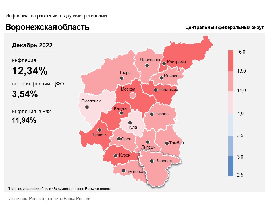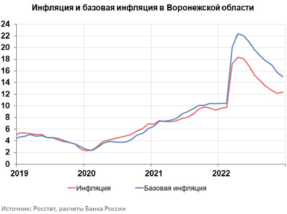 Годовая инфляция в Воронежской области в декабре 2022 года увеличилась до 12,34% после 12,14% месяцем ранее. При этом инфляция в регионе сложилась выше, чем в целом по России (11,94%), но ниже, чем по Центральному федеральному округу (12,46%). На динамику инфляции в регионе повлиял перенос на более ранний срок индексации тарифов на жилищные и коммунальные услуги, а также пересмотр тарифов на проезд в городском транспорте в регионе.
