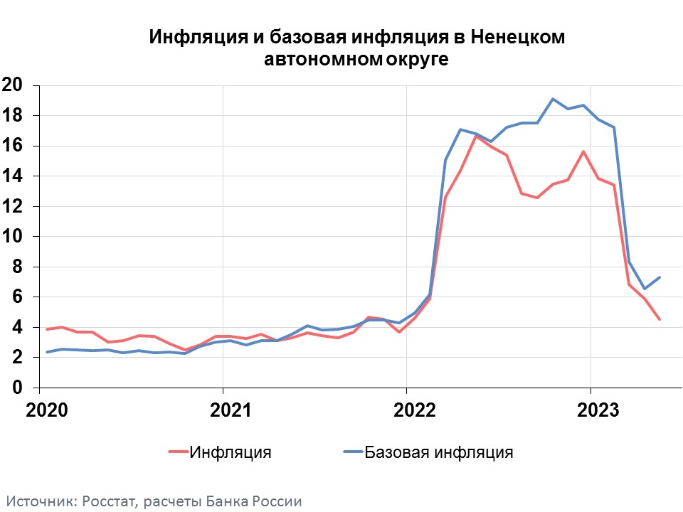 Годовая инфляция в Ненецком автономном округе в мае 2023 года замедлилась до 4,55% после 5,88% месяцем ранее. Она сложилась выше, чем в целом по стране (2,51%) и в Северо-Западном федеральном округе (2,66%). Основной причиной снижения годового темпа прироста цен в регионе стал эффект высокой сравнительной базы прошлого года на услуги воздушного транспорта.