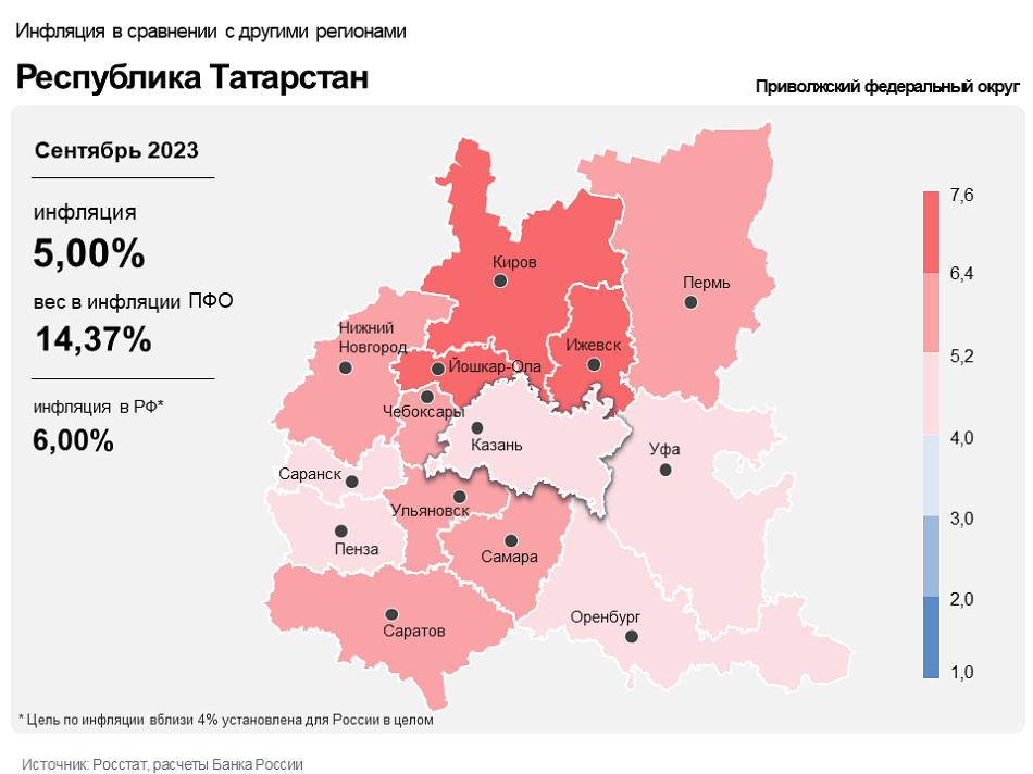 Годовая инфляция в Республике Татарстан в сентябре ускорилась до 5,00% после 4,29% в августе. Основные факторы ускорения инфляции – перенос ослабления рубля в цены и сохранение повышенного спроса на отдельные товары. При этом уровень инфляции в республике остался ниже, чем в Приволжском федеральном округе (5,50%) и в целом в России (6,00%).