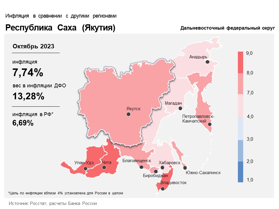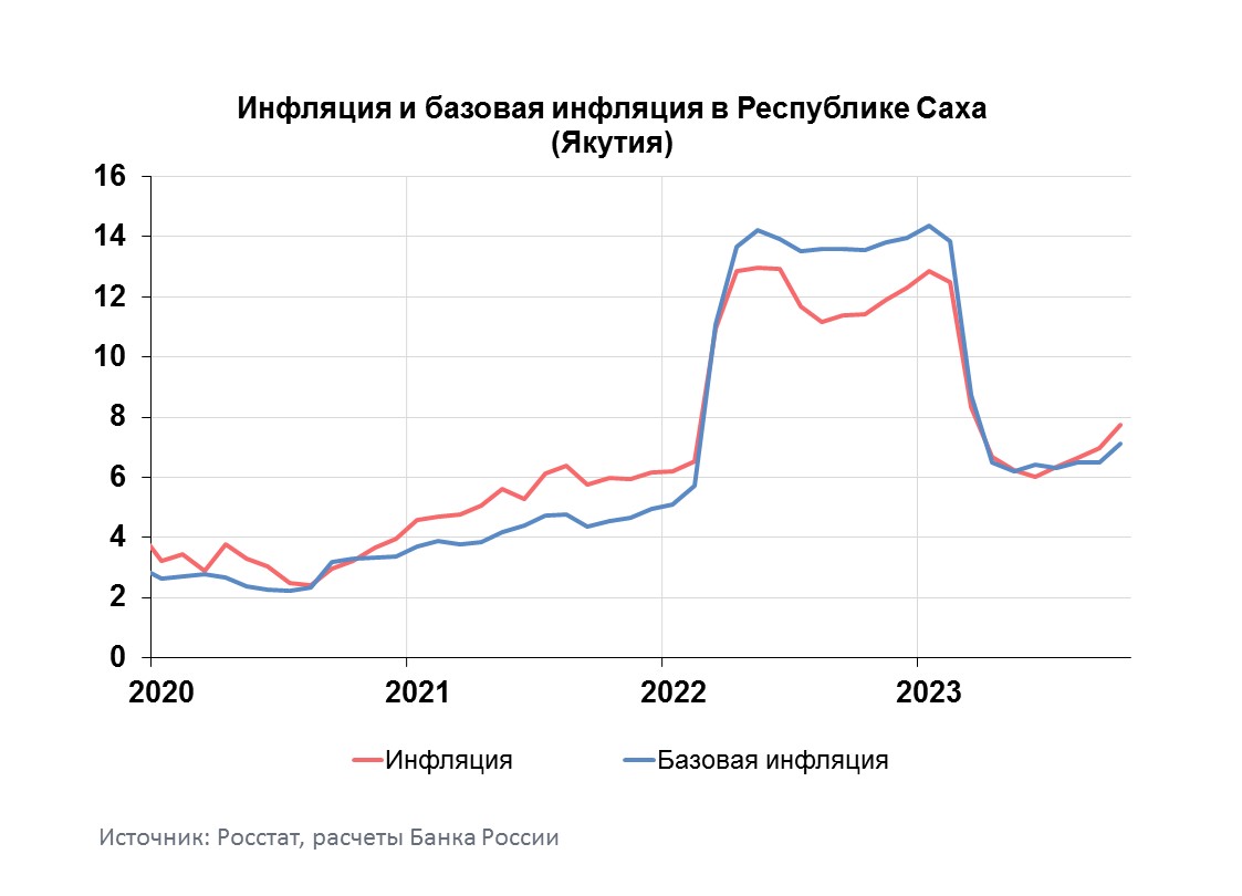 Годовая инфляция в Республике Саха (Якутия) в октябре 2023 года по сравнению с сентябрем ускорилась на 0,76 п.п., до 7,74%. Это выше значений по Дальневосточному федеральному округу (7,67%) и России в целом (6,69%). Ускорение годовой инфляции в республике обусловлено произошедшим раннее ослаблением рубля, ростом издержек производителей и поставщиков товаров и услуг, а также высокой потребительской активностью.