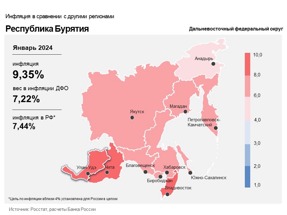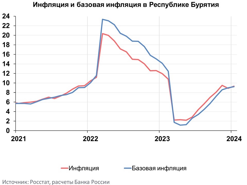 Годовая инфляция в Республике Бурятия в январе ускорилась до 9,35% после 8,89% в предыдущем месяце. Региональная инфляция превысила показатели по Дальневосточному федеральному округу (8,20%) и в целом по России (7,44%). Основная причина ускорения годового роста цен в республике — продолжающийся перенос в цены возросших издержек производителей и поставщиков.