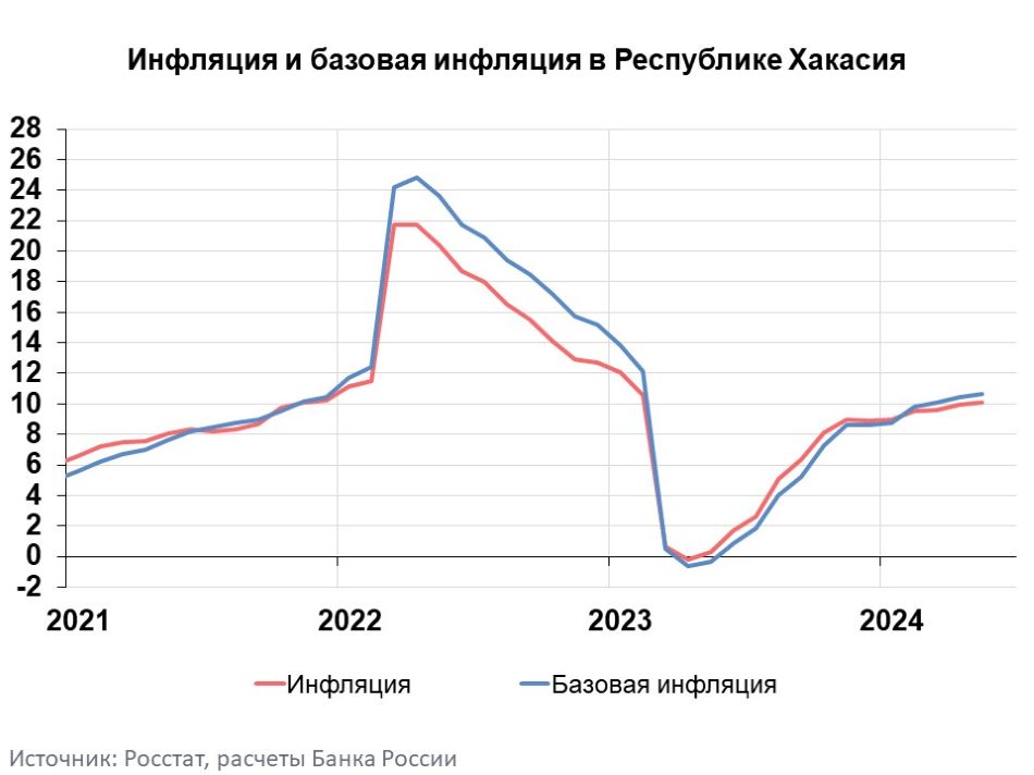 Годовая инфляция в Хакасии в мае ускорилась и составила 10,11% (в апреле — 9,95%). Основные причины — перенос в цены возросших издержек производителей и поставщиков продовольственных товаров, а также сокращение предложения некоторых продуктов питания. В целом по России годовая инфляция в мае составила 8,30%, по Сибирскому федеральному округу — 8,92%.