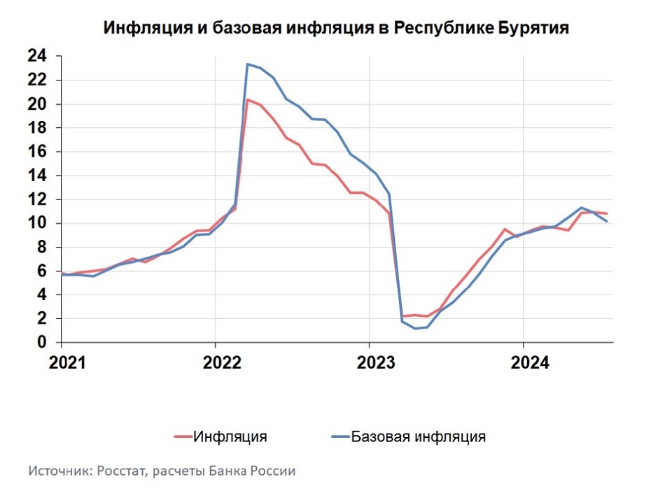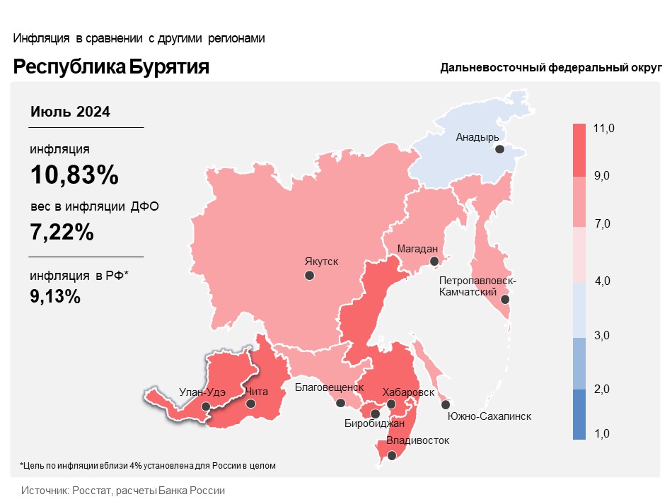 Годовая инфляция в Республике Бурятия в июле замедлилась и составила 10,83% после 10,89% в предыдущем месяце. Это выше, чем по Дальневосточному федеральному округу (9,58%) и в целом по России (9,13%). Основная причина замедления роста цен — увеличение предложения на отдельных товарных рынках.